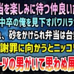 【感動する話】父が他界し中卒で就職した俺。仲良くなり母の手作り弁当を楽しみに待つホームレス…偶然現れたパワハラ女上司に砂をかけられ台無し→後日、謝りに行くとにっこり笑う高級スーツの男がいて【泣ける話】