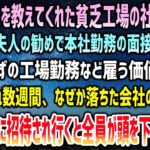 【感動する話】大切な事を教えてくれた貧乏工場社長が他界…倒産し夫人の勧めで本社の面接へ行くも門前払い「工場勤務ごときが来るなw」→ある日、なぜか忘年会に社長直々に呼ばれると社員が頭を下げ…【泣ける話】